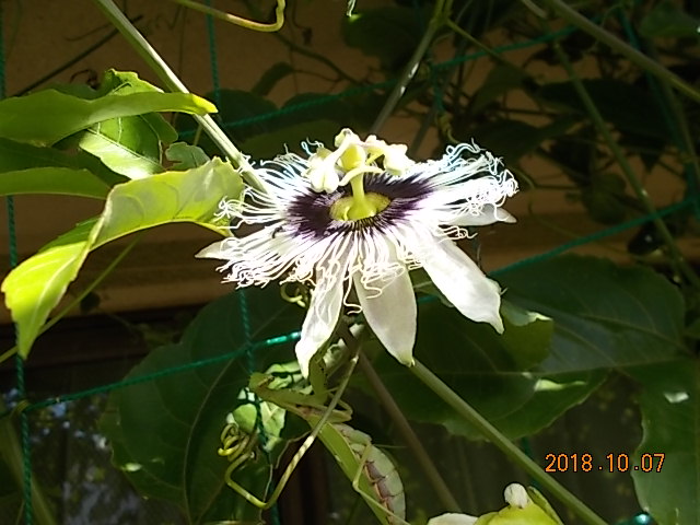 墓園管理事務所でグリーンカーテンとして育てていたパッションフルーツが、 2年目にしてついに花を咲かせました!